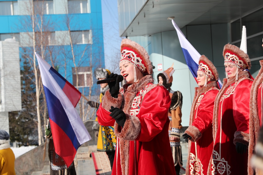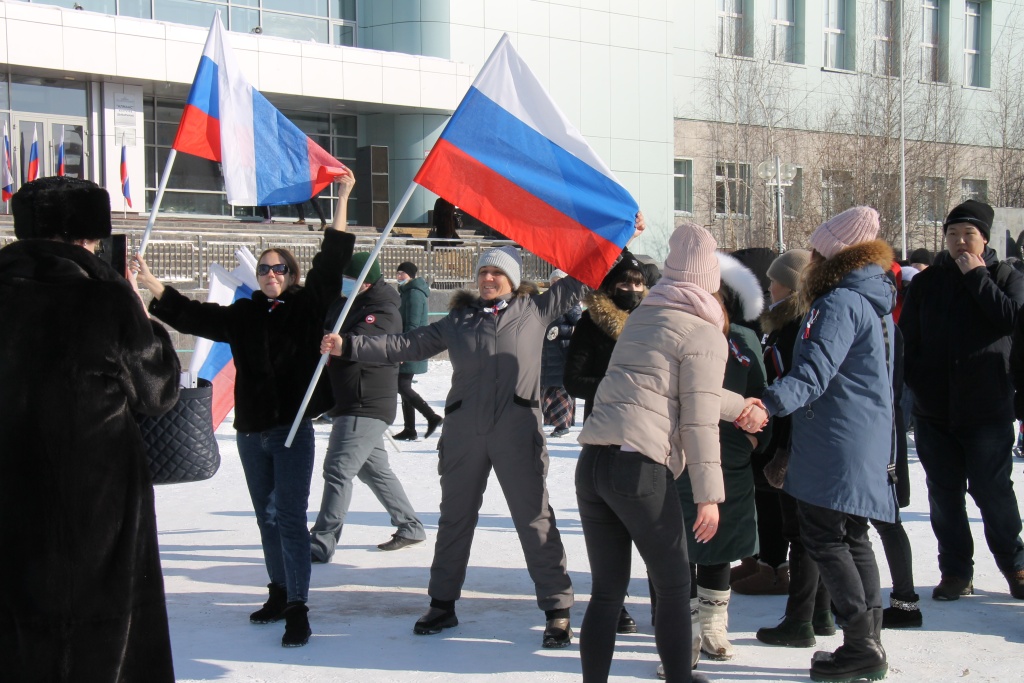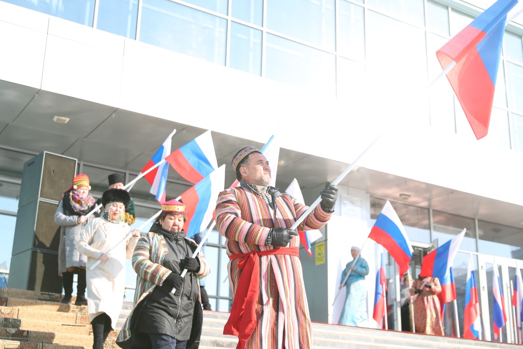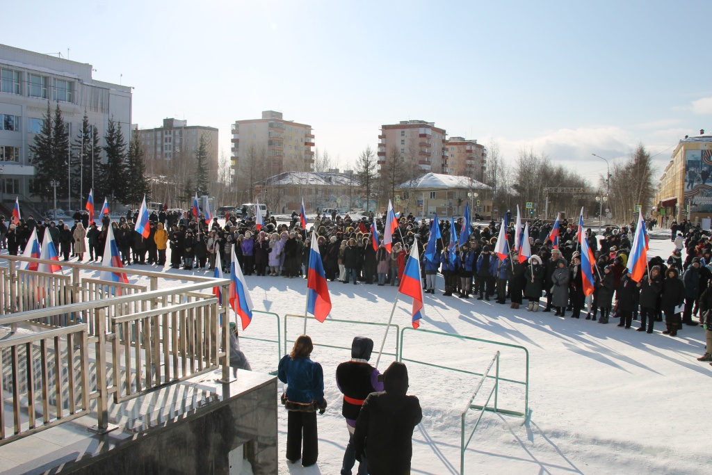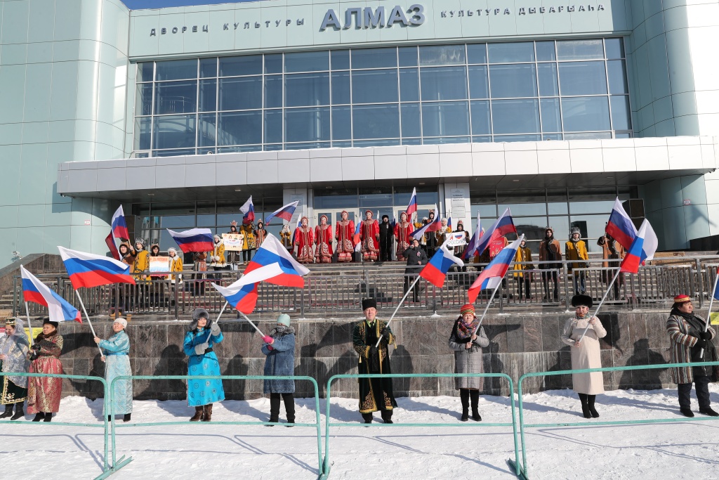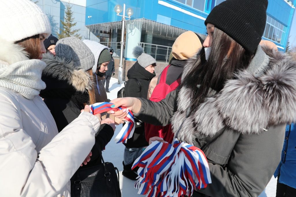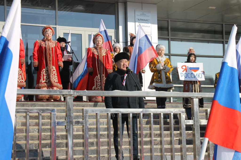 В этот день прозвучали патриотические песни о России, волонтеры всем раздали памятные ленты-триколора нашей страны. Представители Мирнинского отделения Ассамблеи народов РС (Я) организовали флэшмоб с российскими флагами и плакатами #ZaМир #ZаРоссию.