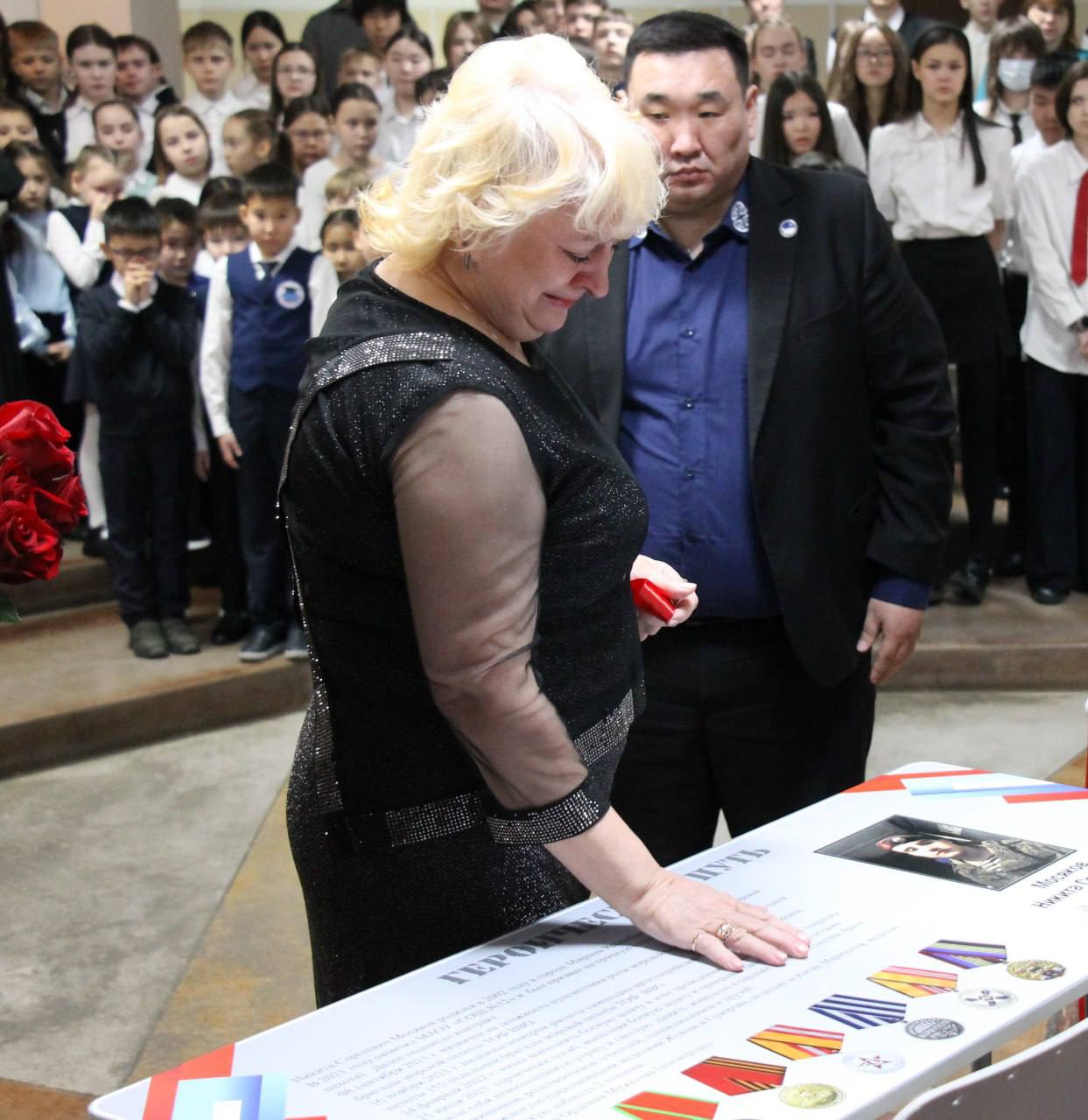 Право открыть мемориальную парту было предоставлено самому дорогому человеку — маме героя, Ирине Михайловне, а также главе района Александру Басырову и директору школы Адьяну Болдыреву.