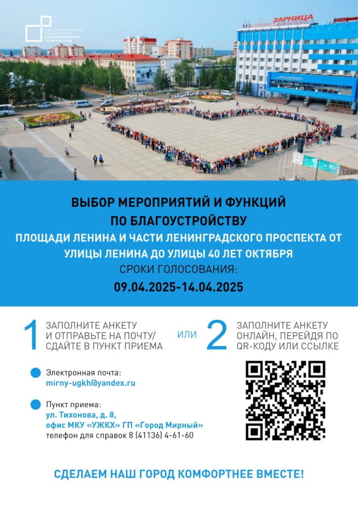 Подготовка заявки будет состоять из нескольких этапов, в каждом из которых важно участие горожан. Если Вы оказались на этой странице, значит, Вам небезразлично будущее городской среды Мирного, ведь это результат деятельности всех его субъектов (администрации/бизнеса/жителей). Ваше активное участие позволит нам создать сильный проект, учитывающий мнения и предложения различных социальных групп, живой и объединяющий жителей. Участие каждого повышает шансы проекта на победу во Всероссийском конкурсе. Все результаты будут отражены в конкурсной заявке.
